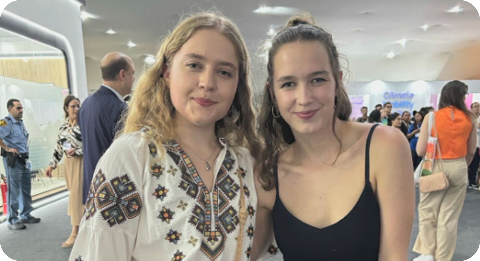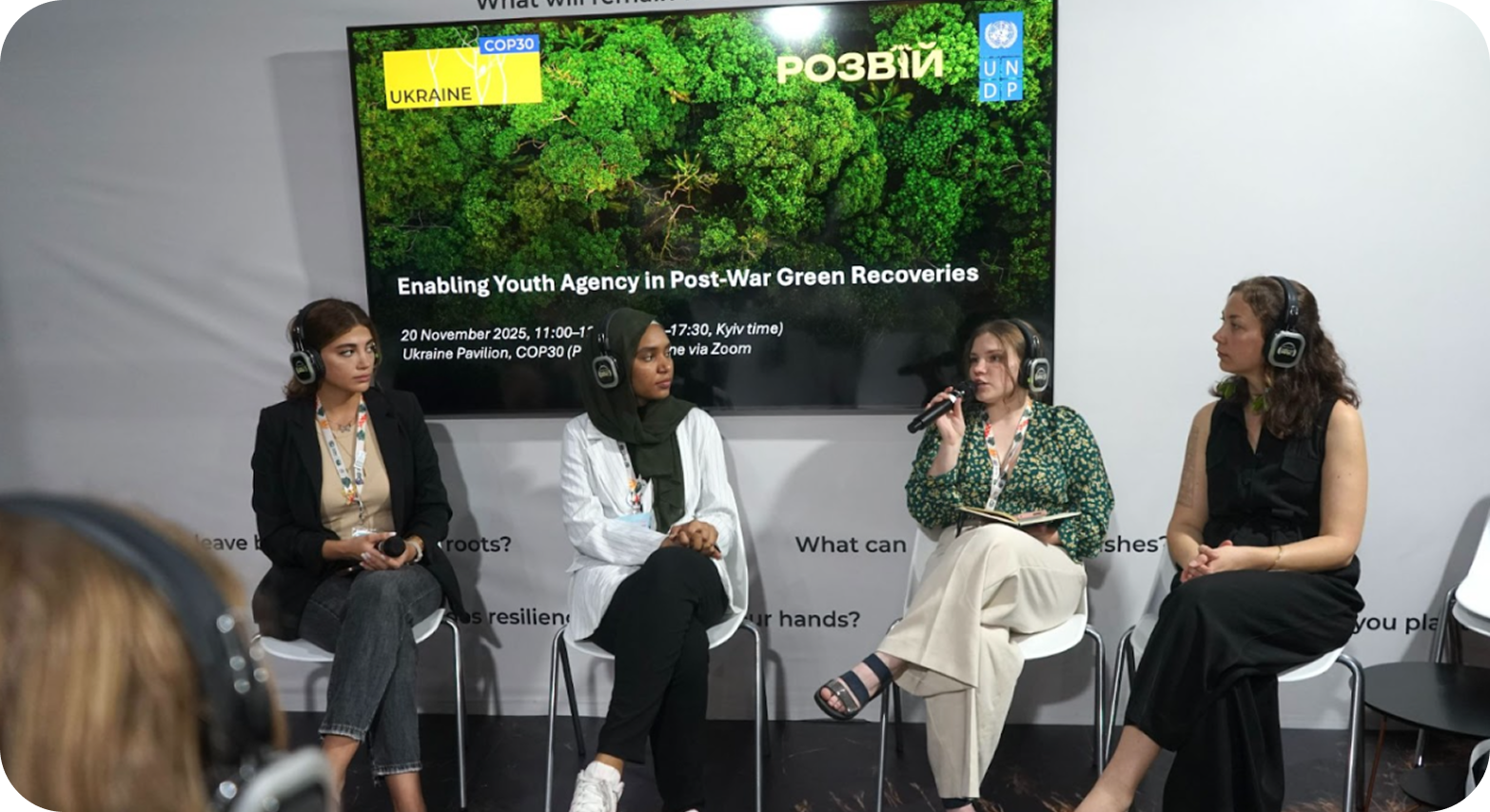 На другому тижні конференції, «Розвій» зібрав у Павільйоні України молодих активістів, дослідниць з Судану, Сирії, України та Палестини аби обговорити спільні виклики щодо інклюзивної післявоєнної відбудови. Завдяки Валерії Бондарєвій у ролі модераторки та спікерки, дискусія висвітлила наскільки схожі досвіди одночасно життя з війною та її наслідками і адвокація за справедливу кліматичну політику попри географічні та культурні відмінності.